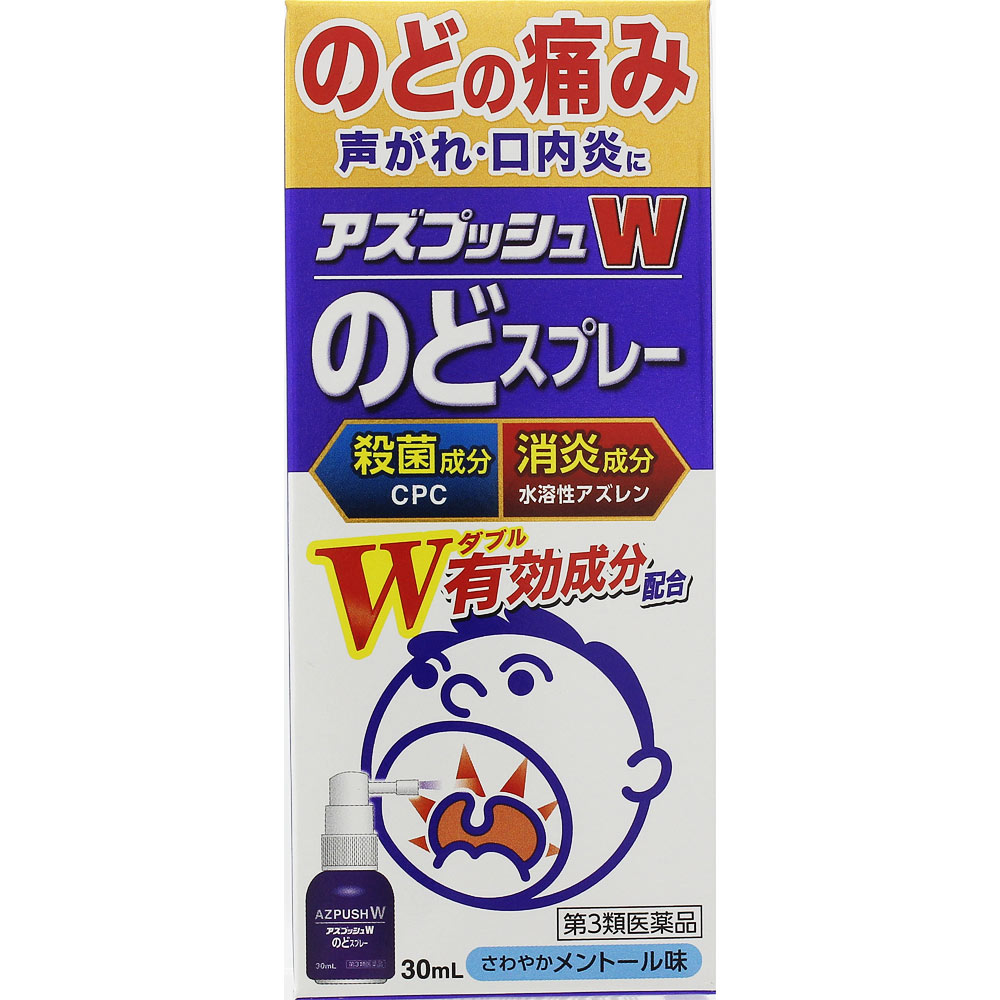 のどの痛みやはれの原因である炎症を抑えるのどスプレーです。殺菌成分<セチルピリジニウム塩化物水和物>が患部を殺菌し、消炎成分<アズレンスルホン酸ナトリウム水和物>が炎症部に直接作用します。