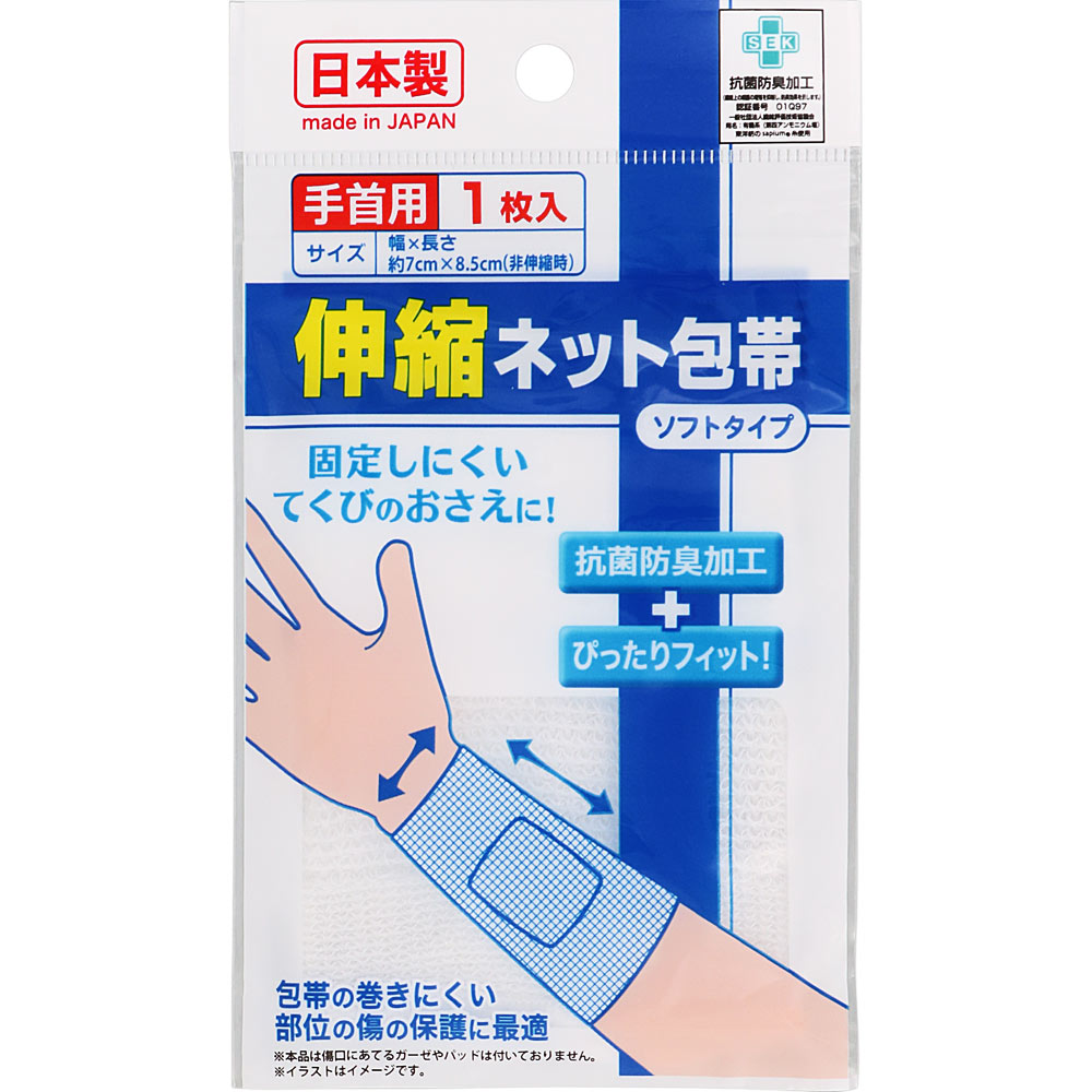 伸縮性に優れ、患部に通しやすく、ガーゼでしっかりと固定するタイプのネット包帯です。