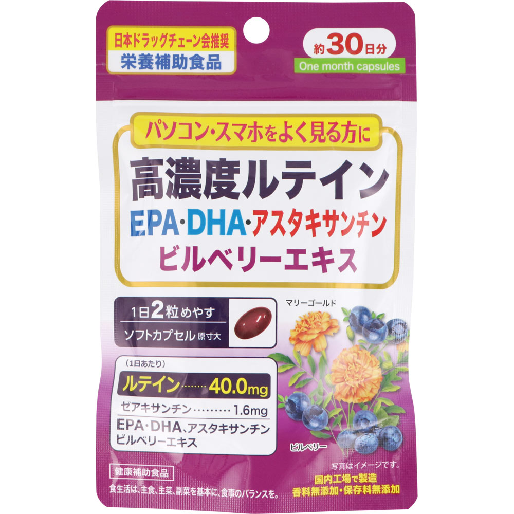 2粒あたり、ルテイン40mgに加え、ゼアキサンチン、EPA、DHA、アスタキサンチン、ビルベリーエキスをプラスしたサプリメントです。
