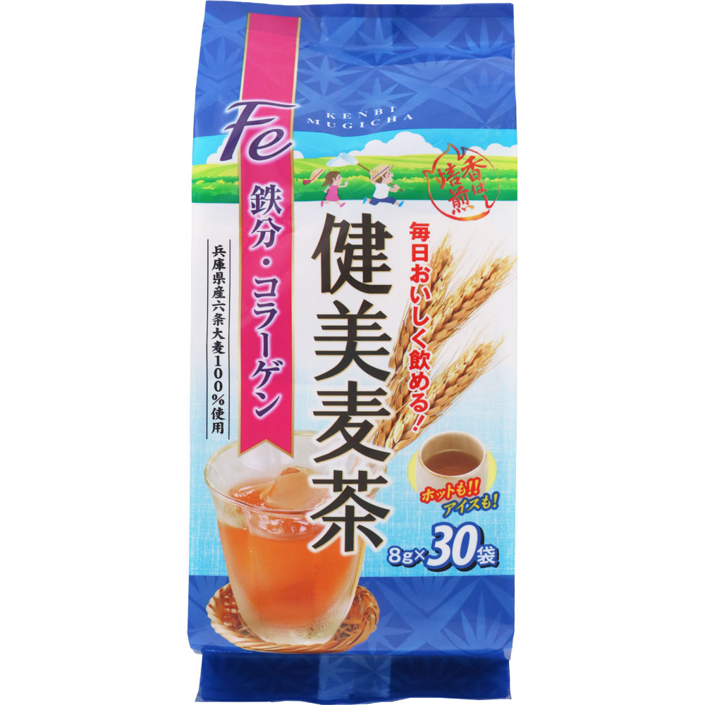 香ばしく焙煎した、兵庫県産六条大麦100%使用しました。鉄分、コラーゲン配合の健康麦茶です。ホットでもアイスでもおいしくお飲みいただけます。原材料:国産六条大麦、コラーゲン(フィッシュコラーゲン)、鉄分(クエン酸第一鉄ナトリウム)。