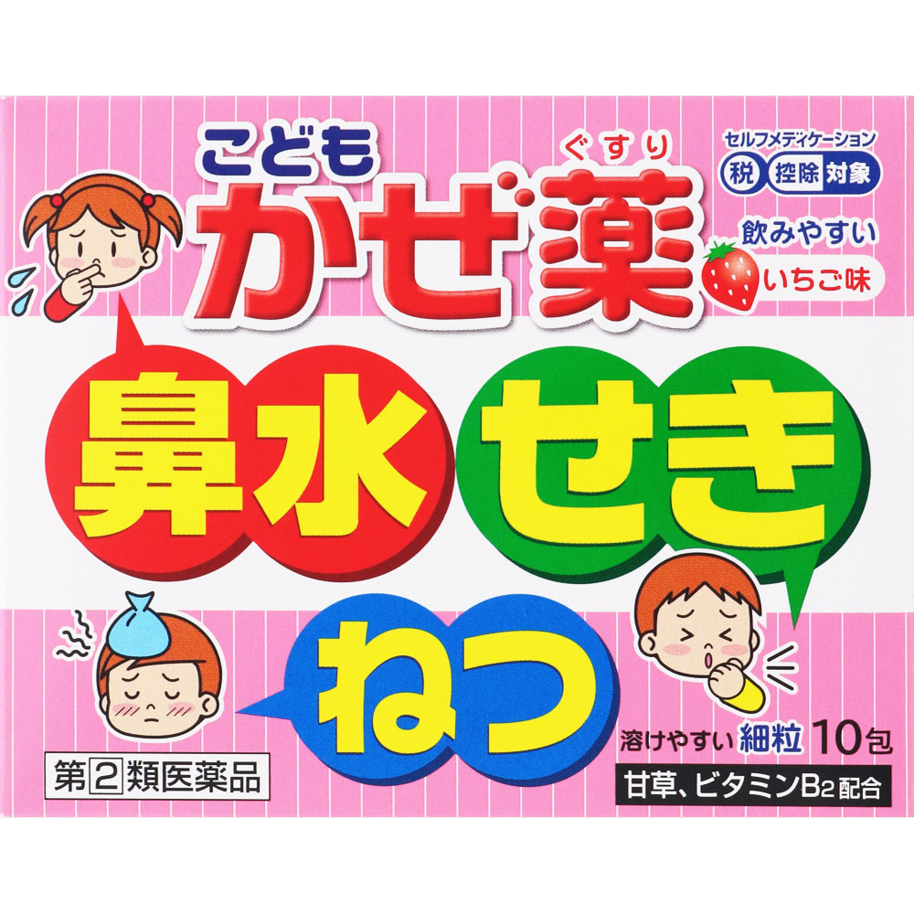 熱を下げるアセトアミノフェン、鼻水、くしゃみを抑えるクロルフェニラミンマレイン酸塩、せきを鎮めるチペピジンヒベンズ酸塩、のどの痛みを抑えるカンゾウエキス末などを配合しており、お子様によくあるかぜ症状に効果があります。いちご味の細粒なので、お子様が飲みやすくなっています。