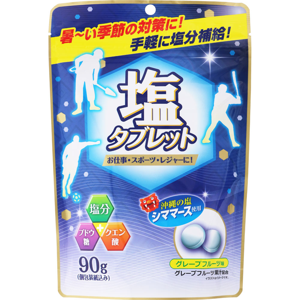 ぶどう糖に沖縄の塩「シママース」とクエン酸を配合した、暑さ対策やスポーツ・レジャー時の塩分補給に適したタブレットです。暑い季節の対策に、手軽に塩分補給できます。グレープフルーツ味。