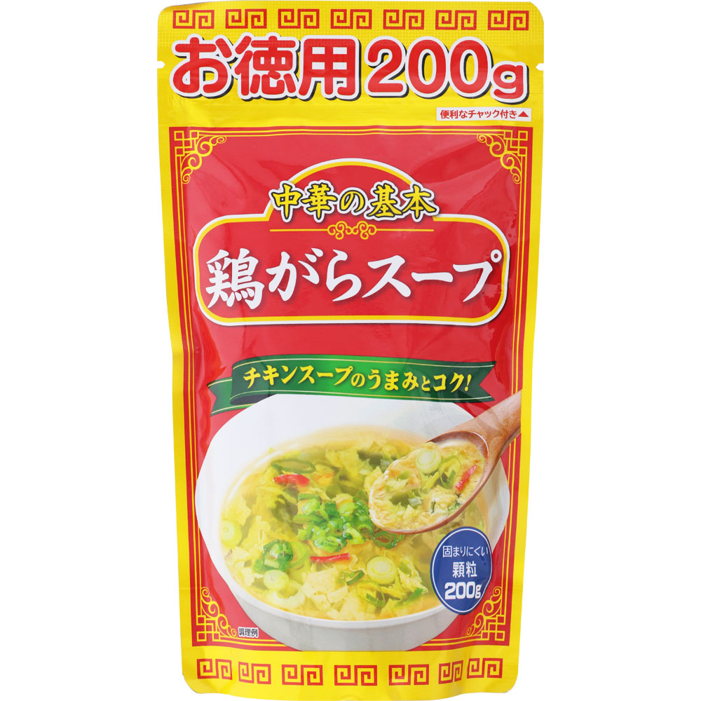 中華料理を始め、さまざまな料理に使える顆粒タイプの鶏がらスープです。鶏ガラから煮出したチキンスープの旨味とコクが味わえます。保存に便利なチャック付き。200g入りのお徳用サイズです。