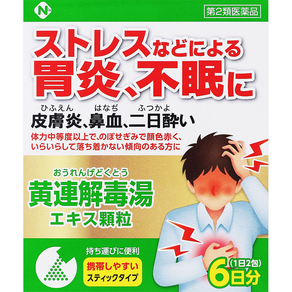 「黄連解毒湯」が二日酔い、皮膚炎、鼻血、ストレスなどによる胃炎、不眠などの不快な症状に効果を現します。1日2回服用、1回1包。持ち運びに便利なスティックタイプです。