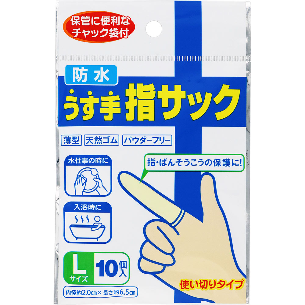 薄くよく伸び、どの指にもぴったりフィットして、指先を水からガードする指サックです。水仕事や入浴の際、絆創膏を貼った指の保護にお使いください。保管に便利なチャック袋付きです。Lサイズ。