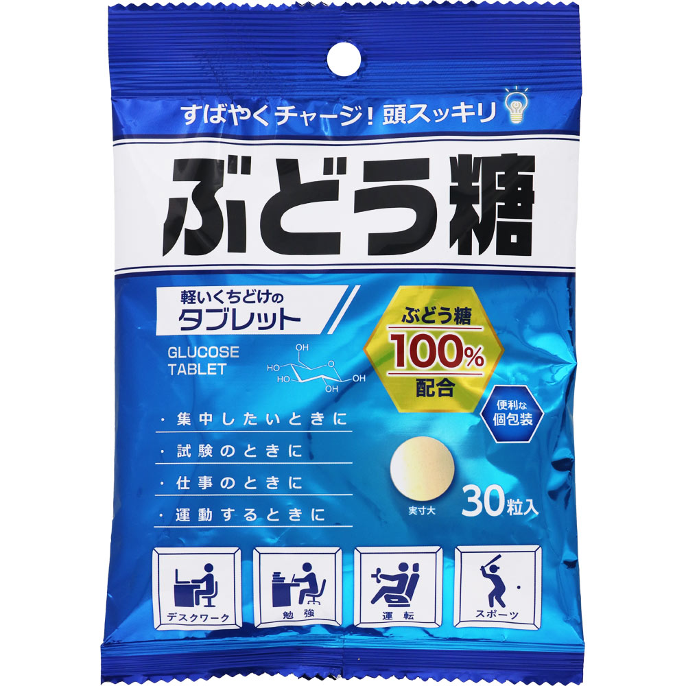 ぶどう糖をおいしいタブレット(粒)にしました。サッと溶ける軽いくちどけのぶどう糖です。個包装になっているので、携帯にも便利です。勉強や、仕事、集中したいときにどうぞ。