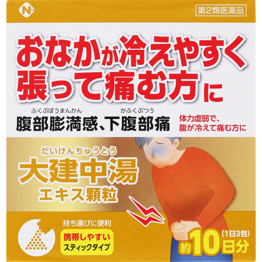 おへそのまわりが冷たく、腹痛のある方や、ガスなどでおなかが張りやすい方におすすめ。おなかを温め腸のはたらきを整えることで、腹痛やおなかの張りをやわらげる漢方薬です。からだが冷え、寒いところにいくと症状が悪化する方などに向いています。