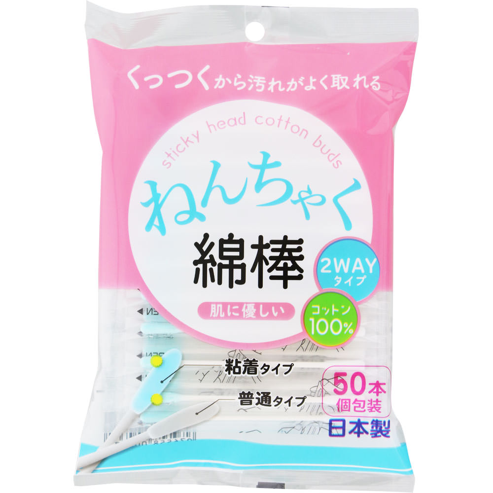 粘着タイプと普通タイプを1本におさめた2wayタイプの綿棒です。粘着タイプの水色の綿球で汚れをくっつけて取り、仕上げに普通タイプの綿棒で浮き上がった汚れをからめ取るようにご使用ください。キトサン抗菌加工で、1本ずつパックされているため衛生的です。