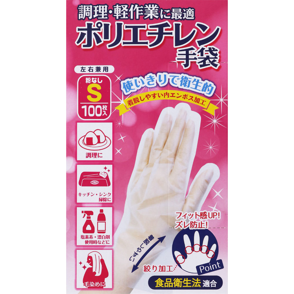 内エンボス加工で作業しやすいポリエチレン手袋です。指の付け根に絞り加工が施されているため、ずれにくくフィット感があります。調理、トイレ掃除、キッチン・シンクの掃除、塩素系漂白剤使用時などに。Sサイズ、100枚入り。