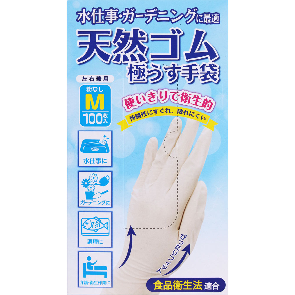 ラテックスを使用した天然ゴム手袋です。粉なしなので、脱着時のいやなべとつきがありません。炊事や掃除、ガーデニング、介護などに。使い捨てタイプ。Mサイズ、100枚入り。