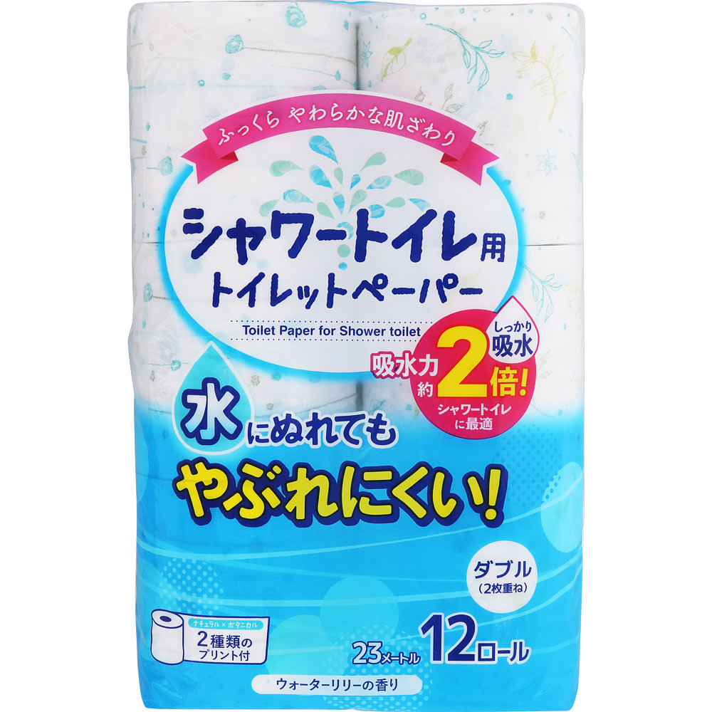 ウォーターリリーの香りが特徴的なシャワー用トイレットペーパー。独自の凹凸加工と紙の厚みにより、しっかりとした吸水力があります。ボタニカル柄をプリントしたトイレが華やかになるデザインです。