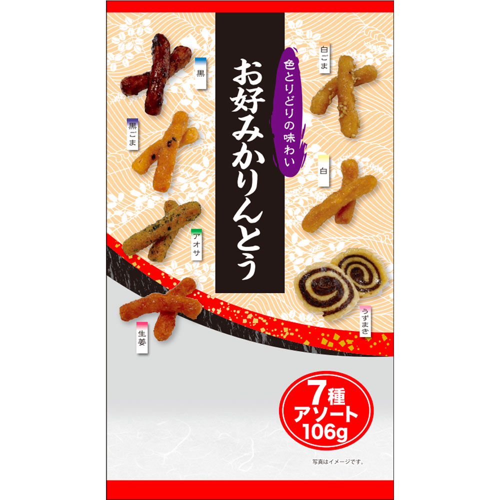黒、白、黒ごま、白ごま、アオサ、うずまき、生姜など、味や形の異なる7種類のかりんとうをアソートしました。やさしい甘さで、どこかなつかしい味が楽しめます。お茶やコーヒーといっしょにお楽しみください。