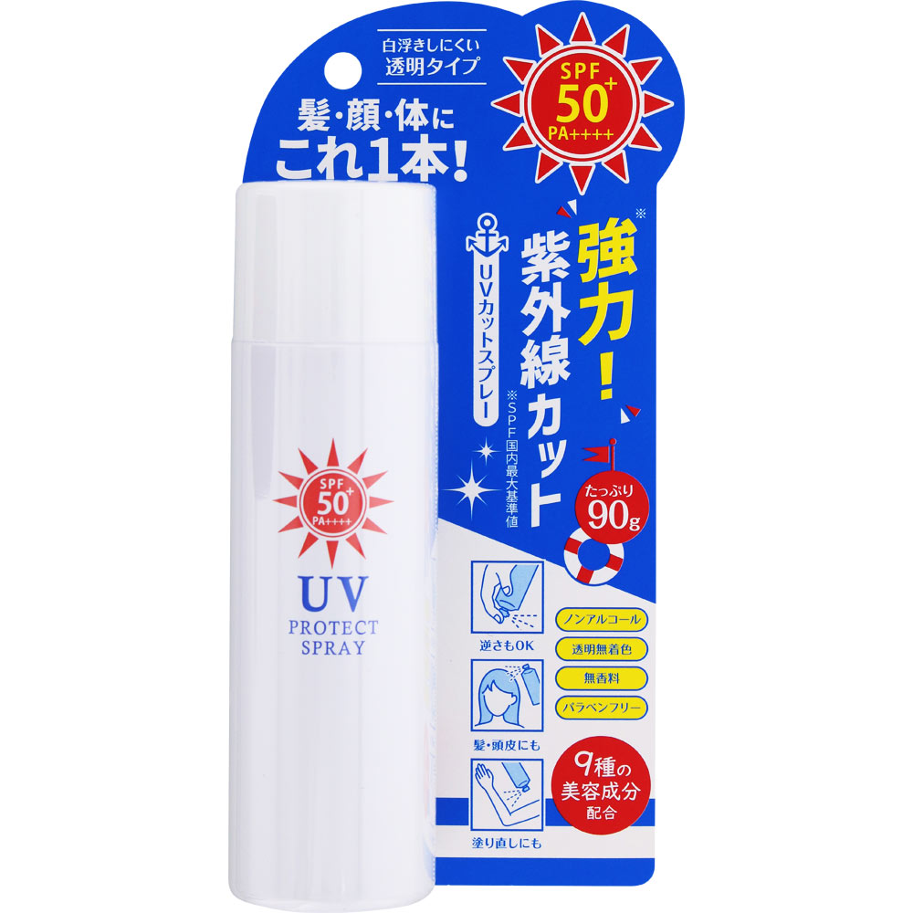 顔、体、髪にも使えるUVカットスプレーです。SPF50+・PA++++で紫外線を強力カット、お肌が喜ぶ9種の美容成分を配合しています。白浮きしない透明タイプなので、メイクの上から使ってもメイク崩れが気になりません。ボトルを逆さにしても使えます。
