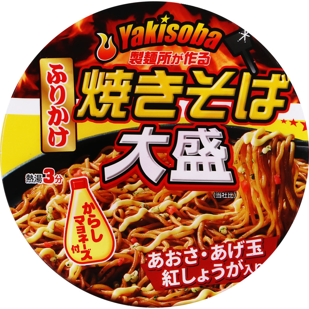 スパイシーなソースとからしマヨネーズが食欲をそそります。あおさ、あげ玉、紅しょうがのバランスも抜群。熱湯3分、忙しいときにもサッと食べられる即席麺タイプ。ボリュームたっぷりの大盛サイズです。