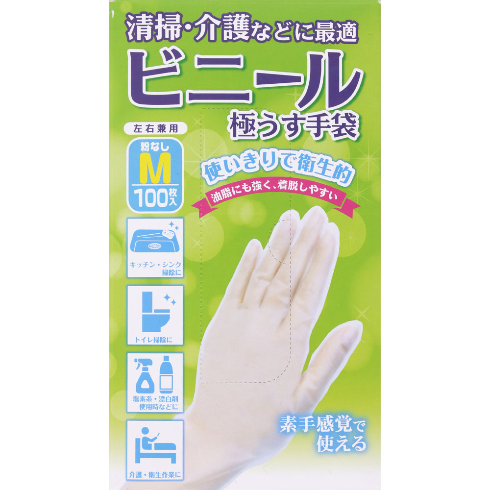 炊事、洗濯、介護などに便利な、使い捨てのビニール手袋です。パウダーフリー加工で手にぴったりフィット。左右どちらの手にもお使いいただけます。Mサイズ、100枚入り。