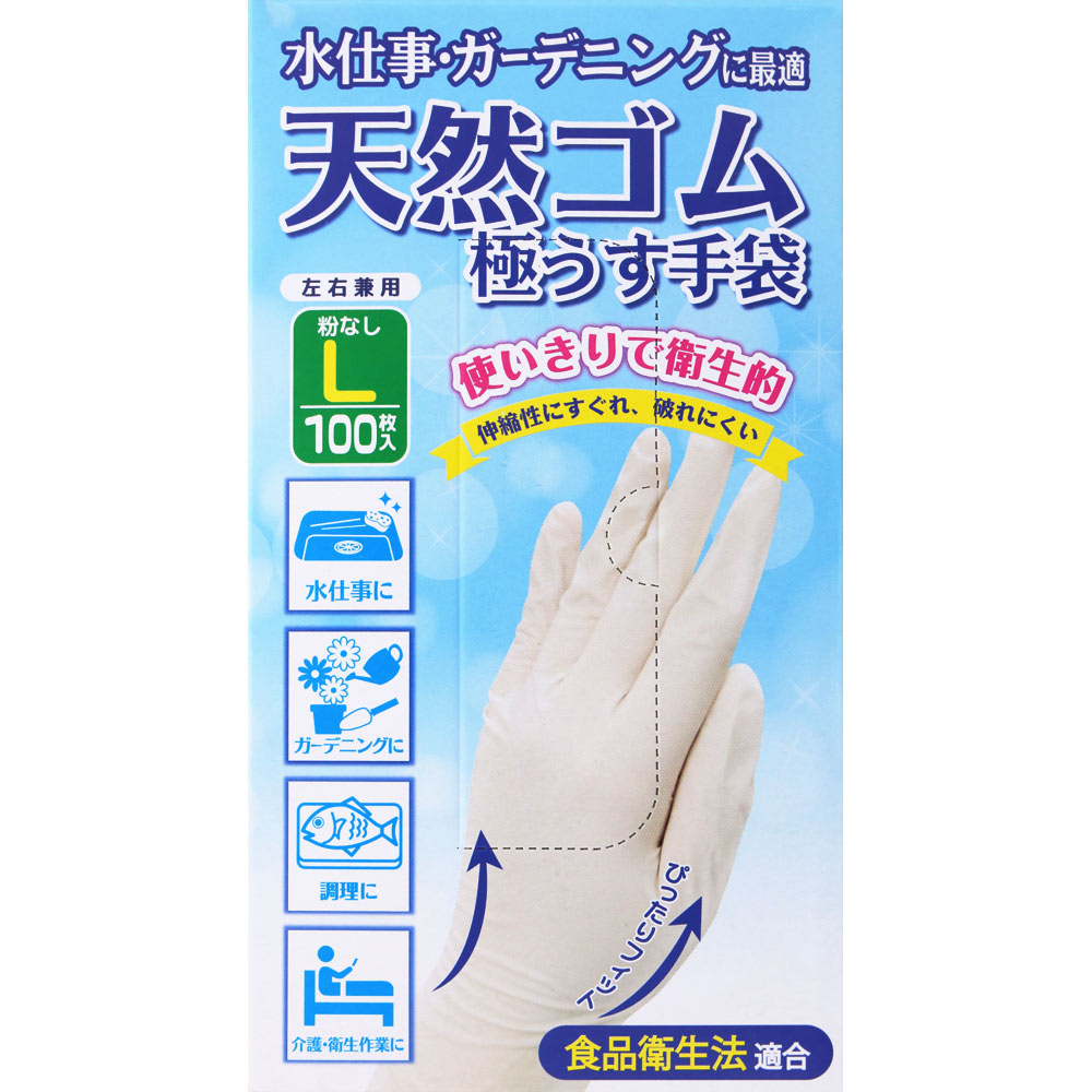 伸縮性に優れ、破れにくい、極うす天然ゴム手袋です。パウダリーフリー加工で、手にぴったりフィット。食品衛生法適合で、調理にもお使いいただけます。左右兼用、Lサイズ、100枚入り。