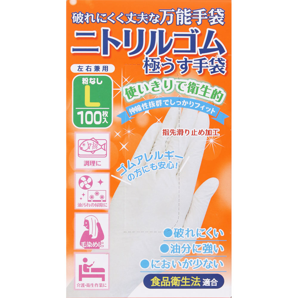 破れにくく丈夫な、極うすニトリルゴム手袋です。パウダリーフリー加工、伸縮性抜群で、手にぴったりフィット。指先に滑り止め加工を施しています。油分に強く、においが少ないため、調理や油汚れの掃除などに最適です。ゴムアレルギーの方にもおすすめ。Lサイズ、100枚入り。