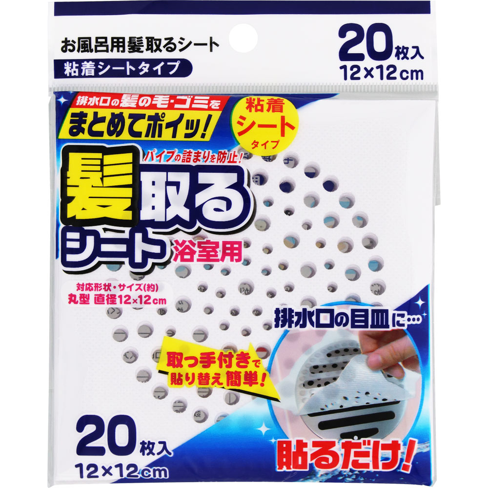 お風呂の排水口に流れる髪の毛をキャッチする不織布シールです。目皿の上に貼るだけで、排水口のつまりを防ぎます。使用後は剥がして捨てるだけなので、手を汚さず衛生的。面倒な排水口の掃除や髪の毛処理をラクにしたい方におすすめです。20枚入り。