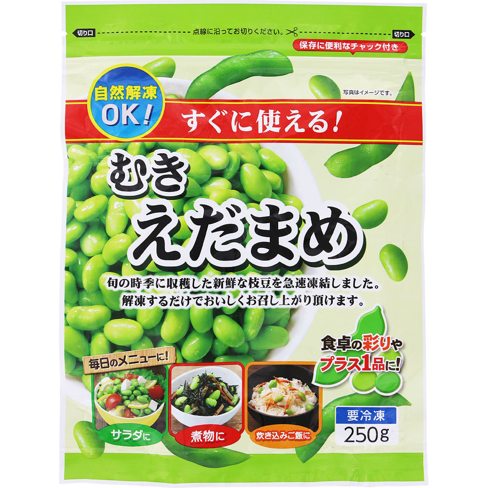 旬の時期に収穫した新鮮な枝豆を急速凍結しました。むき枝豆なので、解凍してサラダや煮物にお使いください。チャック付きで保存にも便利です。