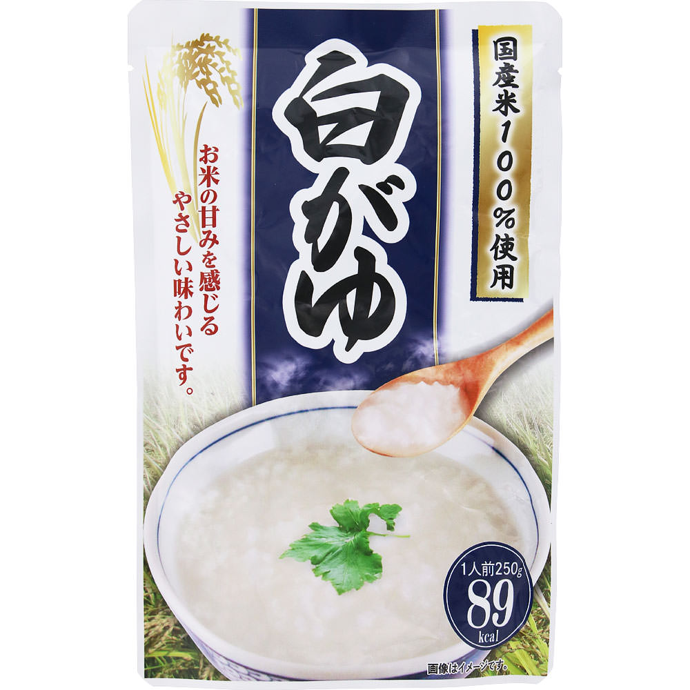 国産米を100%使用した、やさしい味わいの白がゆです。食べたいときに、そのままおいしくお召し上がりいただけます。食欲のないときや体調不良のとき、また災害時の備蓄にも便利です。