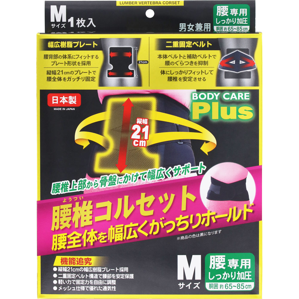 縦幅21cmの幅広樹脂プレートが、腰椎上部から骨盤にかけて幅広くサポート。また、本体ベルトと補助ベルトの二重構造により、腰のぐらつきを抑え、腰椎を安定させます。通気性に優れたメッシュ素材を採用。装着時も長時間快適にお過ごしいただけます。男女兼用、Mサイズ。