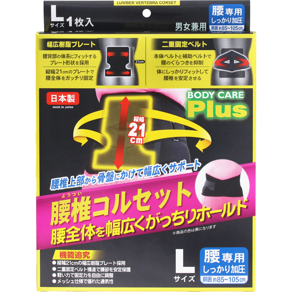 縦幅21cmの幅広樹脂プレートが、腰椎上部から骨盤にかけて幅広くサポート。また、本体ベルトと補助ベルトの二重構造により、腰のぐらつきを抑え、腰椎を安定させます。通気性に優れたメッシュ素材を採用。装着時も長時間快適にお過ごしいただけます。男女兼用、Lサイズ。
