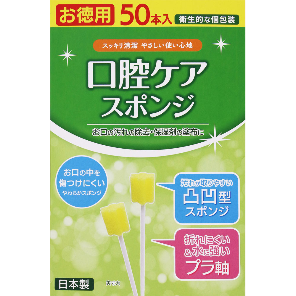 お口の中の汚れの除去や保湿剤の塗布等に使える、口腔ケア用のスポンジブラシです。凹凸のあるスポンジ側面が、汚れを効果的に取り除き、お口のすみずみまできれいに清掃できます。1本ずつの個包装で使いきりなので衛生的。水や歯みがき剤、消毒液を浸してお使いいただくこともできます。50本入り。