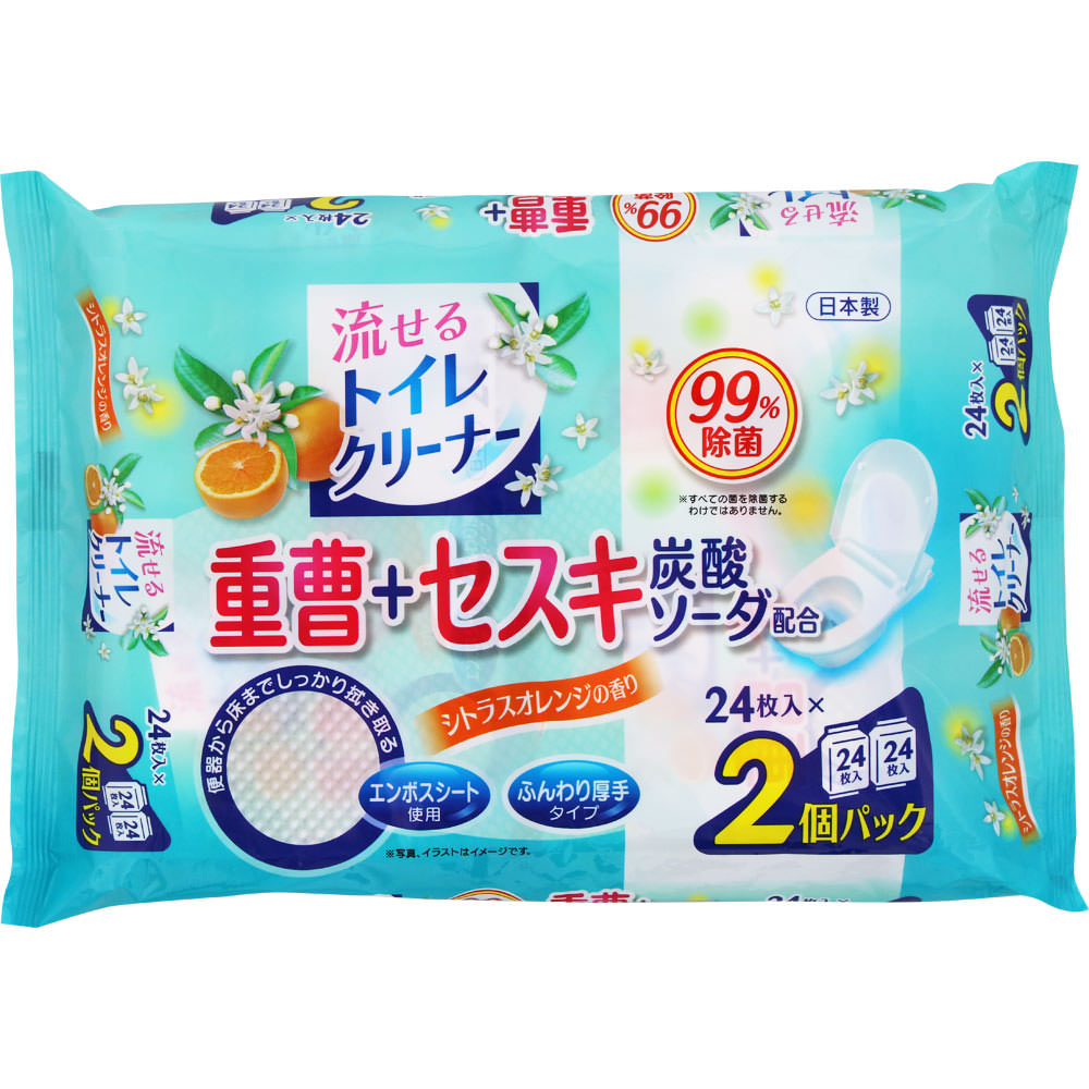 環境にもお肌にもやさしい、重曹とセスキ炭酸ソーダ配合のトイレ用シート。エンボス加工を施した厚手のシートで、便器から床の汚れまですっきり落とします。使用後はそのままトイレに流せるので便利。詰め替え不要のフタシール付きです。シトラスオレンジの香り。24枚入り×2個パック。