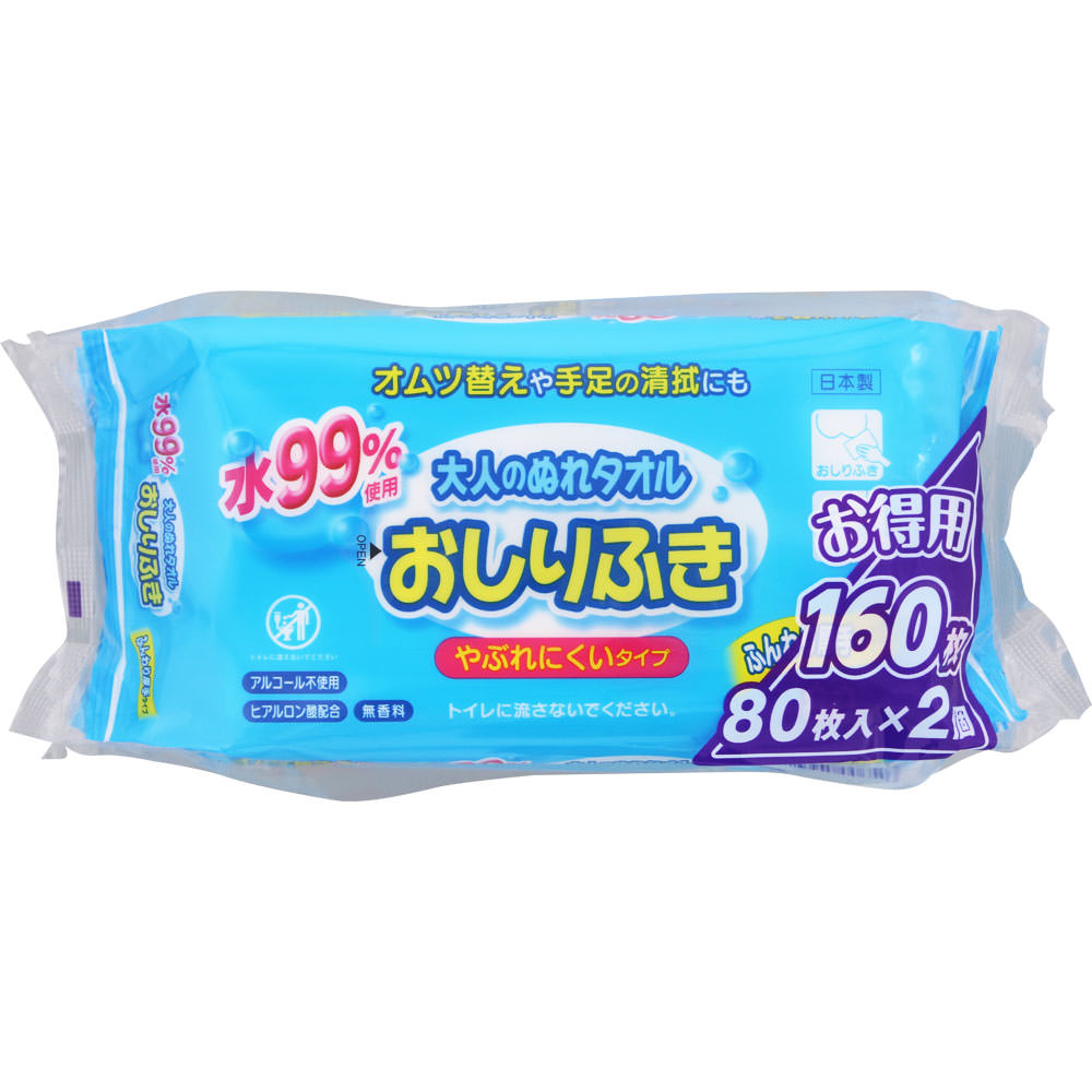 ふんわり厚手で、やぶれにくい大人用おしりふき。水99%使用、アルコール不使用、無香料で、肌に負担をかけません。おむつ替えのときはもちろん、手足の清拭などにもお使いいただけます。80枚入り×2個パック。