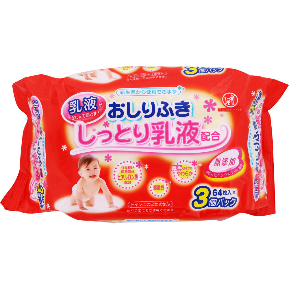 乳液をしみこませた、しっとりとしたやわらかシートのおしりふき。乳液がなじんで、赤ちゃんのお肌をこすらずやさしくふき取ることができます。PG・パラベン・アルコール・香料無添加。新生児から使用可能で、おしりのほか手や足にもお使いいただけます。64枚入り×3個パック。