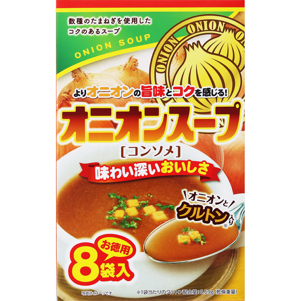 じっくり炒めた数種のたまねぎにチーズとバターオイルを加え、コクのあるスープに仕上げました。クルトン入りで、コンソメの味わい深いおいしさが楽しめます。いつもの食事のお供にどうぞ。お徳用の8袋入り。