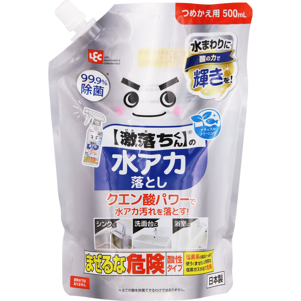 クエン酸のパワーで水アカ汚れを落とします。同時に除菌も可能。シンクや洗面所、浴室などの水アカが気になる場所にお使いください。詰替え用、500mL。