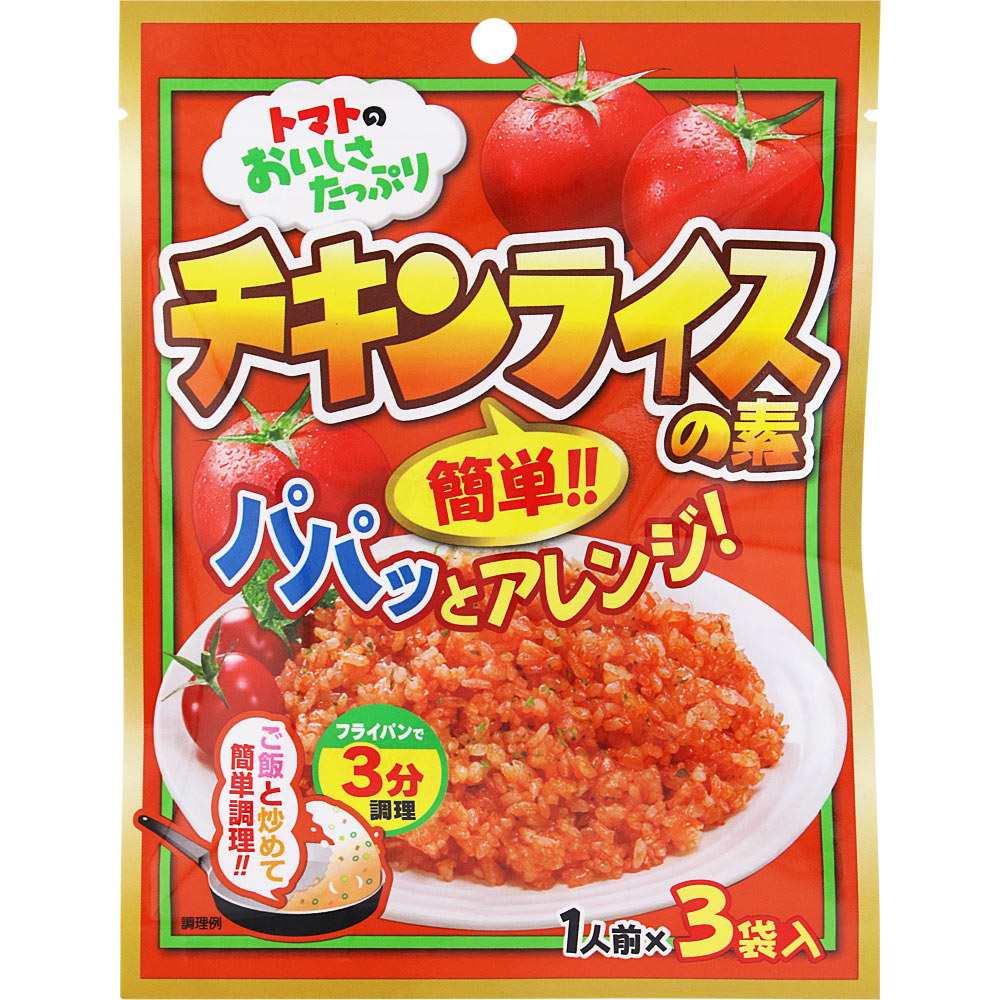 ごはんがあればすぐにできる、粉末タイプのチキンライスの素です。フライパンでサッと炒めるだけで、簡単においしいチキンライスができあがります。お好みの具を加えてアレンジしたり、オムライスにしたりするのもおすすめです。3袋入り。