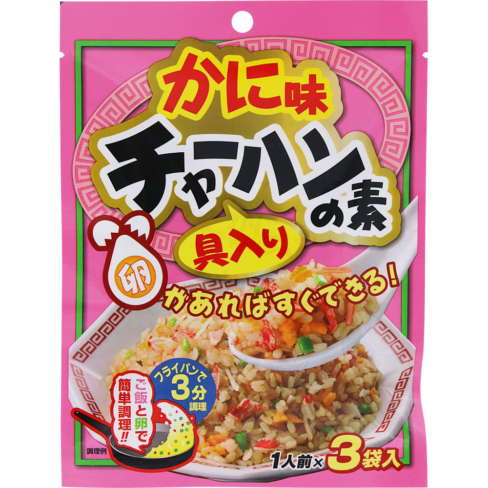 ごはんと卵があればすぐにできる、粉末タイプのかに味チャーハンの素です。フライパンでサッと炒めるだけで、簡単にパラッとおいしいチャーハンができあがります。時間がない日の夕食やパパッと済ませたい昼食などにどうぞ。3袋入り。