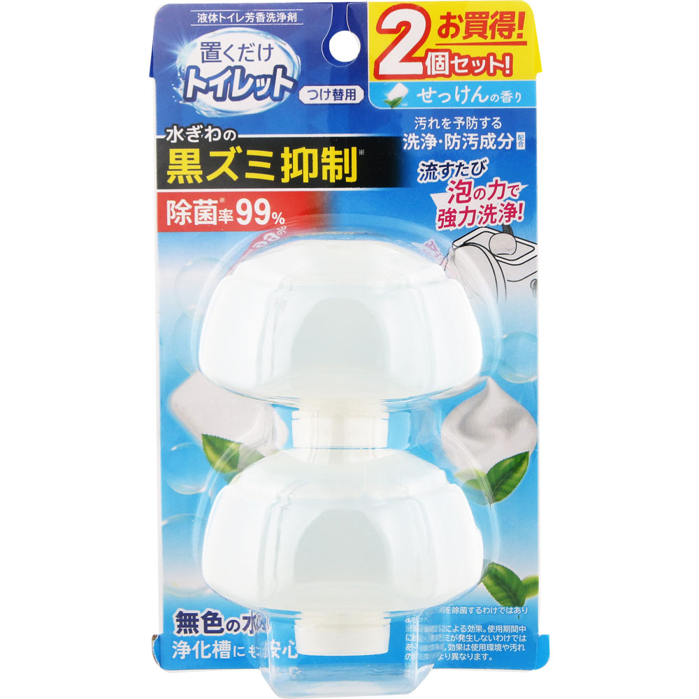 液体トイレ芳香洗浄剤のつけ替用タイプ。洗浄・防汚成分を配合し、トイレを流すたびに泡の力で強力に洗浄します。除菌成分の効果により、除菌率99%で水ぎわの黒ズミを抑制します(※)。2個セットでせっけんの香り。