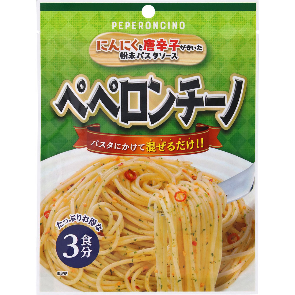 にんにくと唐辛子がきいた粉末パスタソース。パスタにふりかけて混ぜるだけで、簡単においしいペペロンチーノができあがります。茹でたパスタにバターまたはサラダ油をからませるとさらに本格的な味わいが楽しめます。たっぷりお得な3食分。