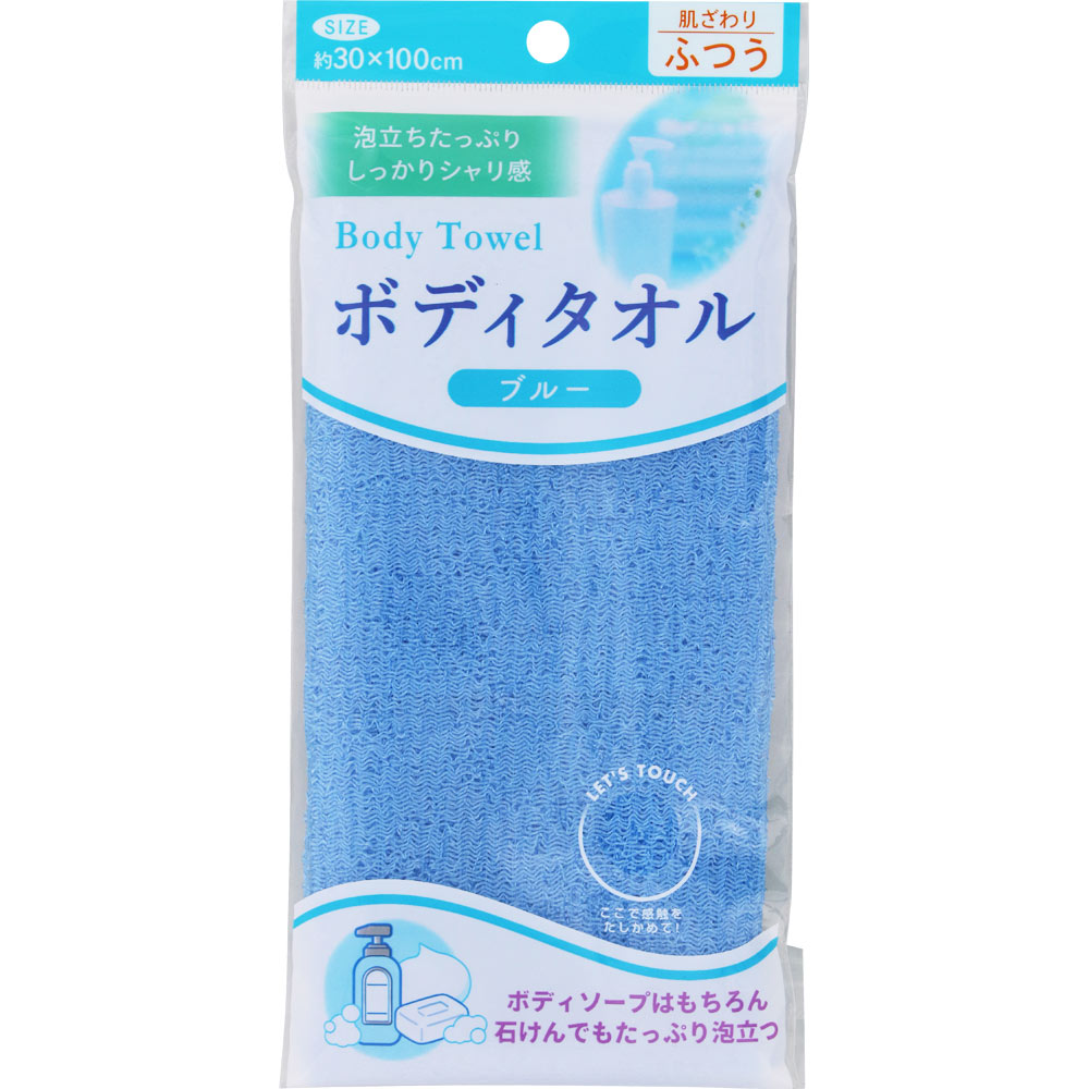 ここちよいシャリ感のあるナイロン製のボディタオルです。少量のボディソープ、石けんのどちらでもよく泡立ちます。さらに、水切れがよく、すすぎが簡単で衛生的。色はブルーで、サイズは約30×100cm。