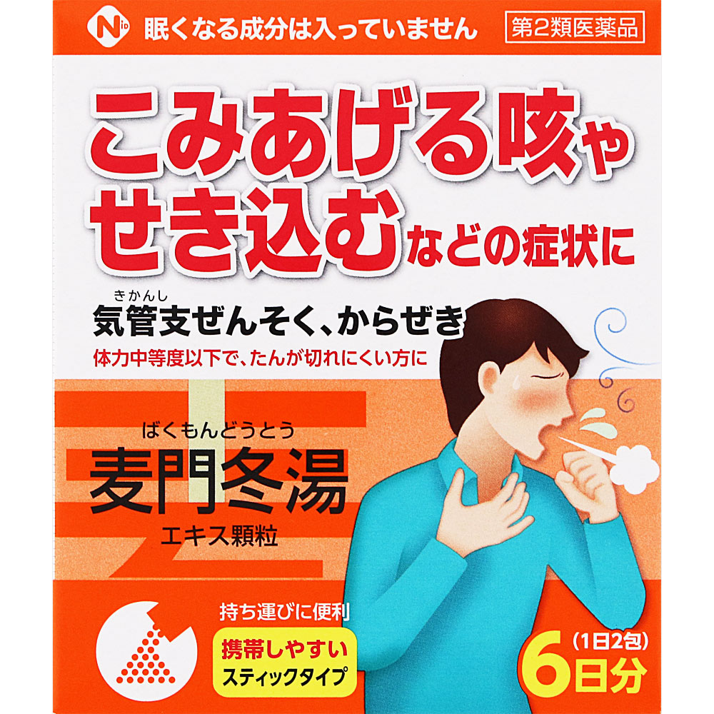 漢方処方の「麦門冬湯」エキスを飲みやすいスティック顆粒タイプにしました。たんの切れにくいせき、からぜき、気管支炎、気管支ぜんそくなどを改善します。2歳以上のお子さまから服用できます。眠くなる成分は入っていません。12包入り。