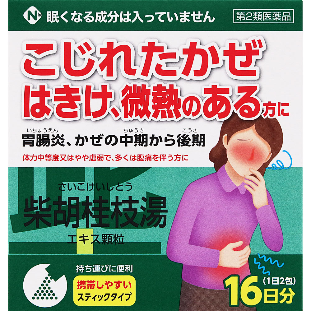 漢方処方の「柴胡桂枝湯」エキスを飲みやすいスティック顆粒タイプにしました。こじれたかぜの症状や吐き気、腹痛などを伴う胃腸炎の症状を改善します。2歳以上のお子さまから服用できます。眠くなる成分は入っていません。32包入り。