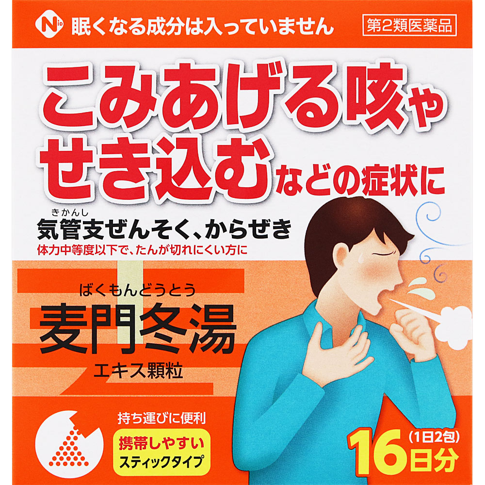 漢方処方の「麦門冬湯」エキスを飲みやすいスティック顆粒タイプにしました。たんの切れにくいせき、からぜき、気管支炎、気管支ぜんそくなどを改善します。2歳以上のお子さまから服用できます。眠くなる成分は入っていません。32包入り。
