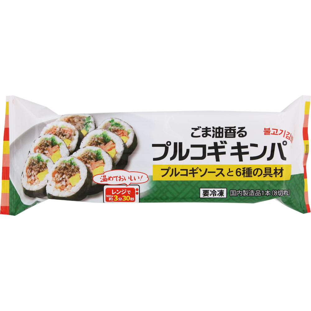 甘辛いプルコギをたっぷり詰めた冷凍キンパです。ごま油の香りが食欲をそそります。手軽にキンパを食べたい方、自宅で韓国料理を楽しみたい方におすすめです。