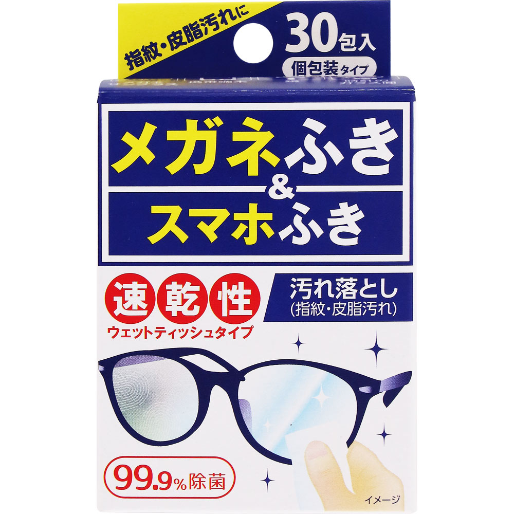 メガネのレンズやスマートフォンの指紋・皮脂汚れを軽くふくだけでスッキリ落とします。速乾性のウエットタイプなので、から拭きがいりません。シートは乾いてからも2-3回使え、個包装なので携帯にも便利です。