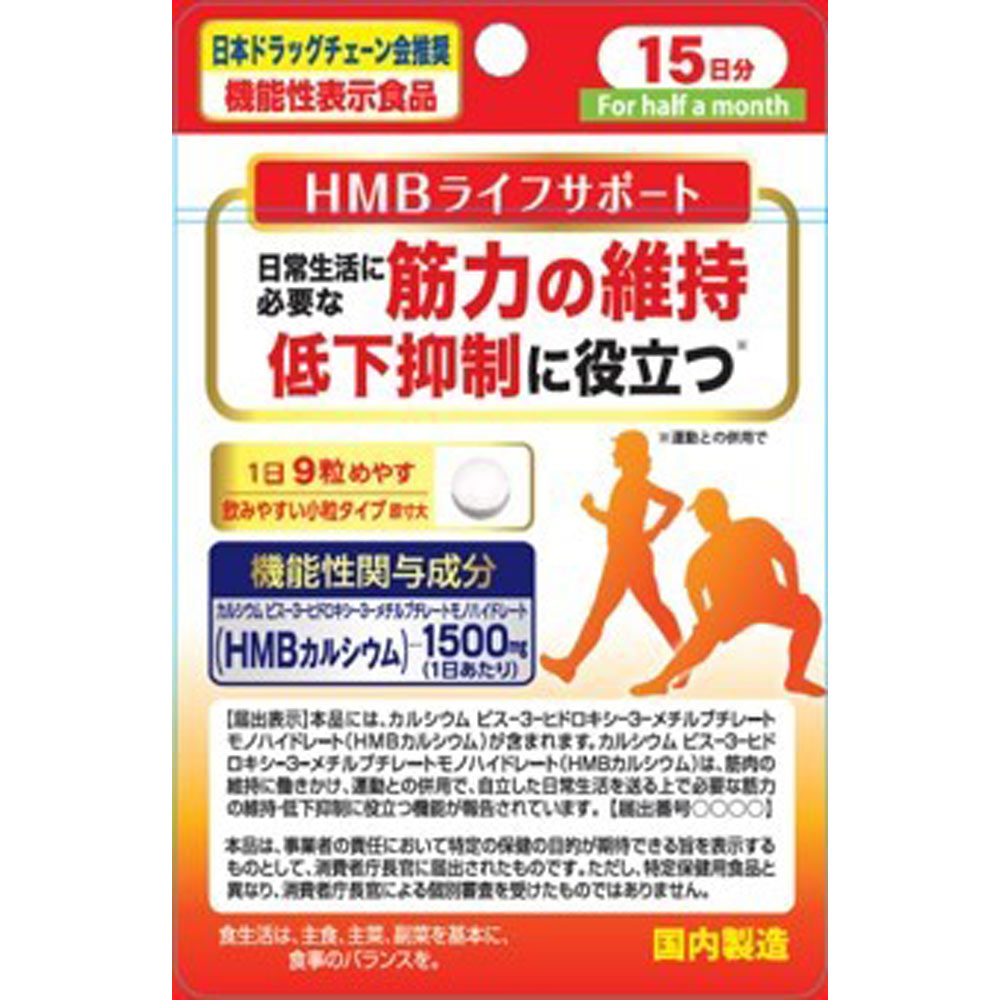 カルシウム ビス-3-ヒドロキシ-3-メチルブチレートモノハイドレート(HMBカルシウム)は、運動との併用で、自立した日常生活を送る上で必要な筋力の維持・低下抑制に役立つ機能が報告されています。1日9粒を目安にお召し上がりください。歩き続けることに不安を感じる方やいつまでも元気で暮らしたい方におすすめです。