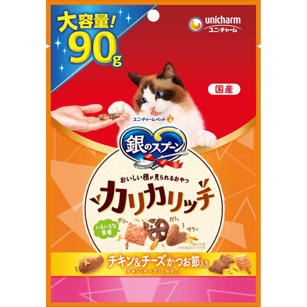 チキン&チーズかつお節入りの猫ちゃん用おやつです。「カリッ」「ポリッ」「サクッ」といろいろな食感が楽しめます。