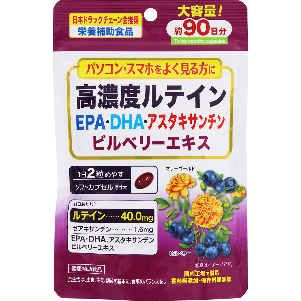 ルテインのほか、ゼアキサンチン、EPA・DHA、アスタキサンチン、ビルベリーエキスなどを配合したサプリメントです。パソコンやスマートフォンを長時間よく見る方におすすめ。香料・保存料無添加。