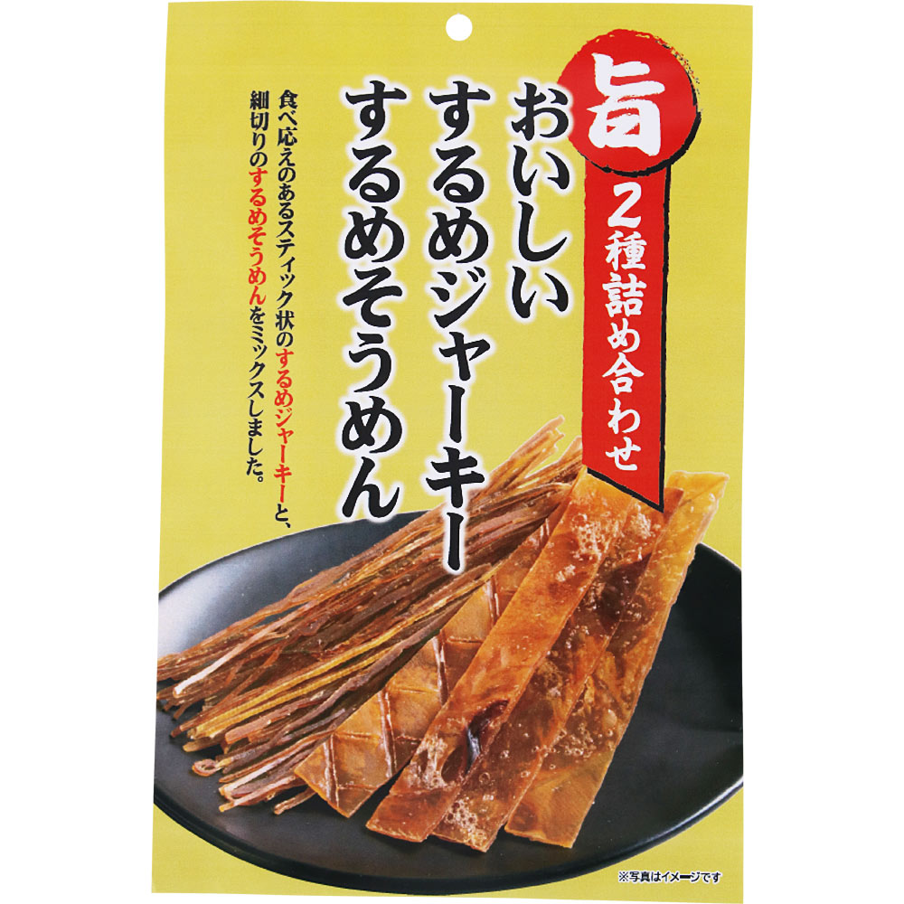 噛み応えのあるするめジャーキーと、細くて食べやすいするめそうめんをミックスしました。1袋で2種類のいかの珍味を味わえます。ビールや日本酒といっしょにお楽しみください。