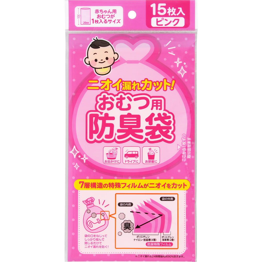 7層構造の特殊フィルムが気になるおむつのニオイモレをカットします。普段使いはもちろん、ドライブや旅行など外出先でのおむつの処理にも便利です。中身が見えにくいピンク色もポイント。赤ちゃん用おむつが1枚入るSサイズ。15枚入り。