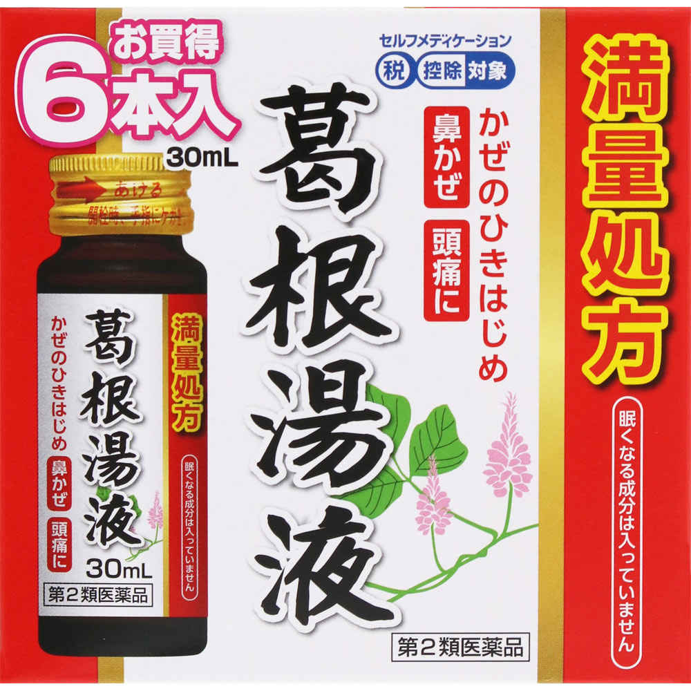 満量処方の葛根湯内服液です。飲みやすいドリンクタイプで、かぜのひきはじめ、鼻かぜ、頭痛などの症状を改善します。眠くなる成分は入っていません。ノンシュガー、6本入り。
