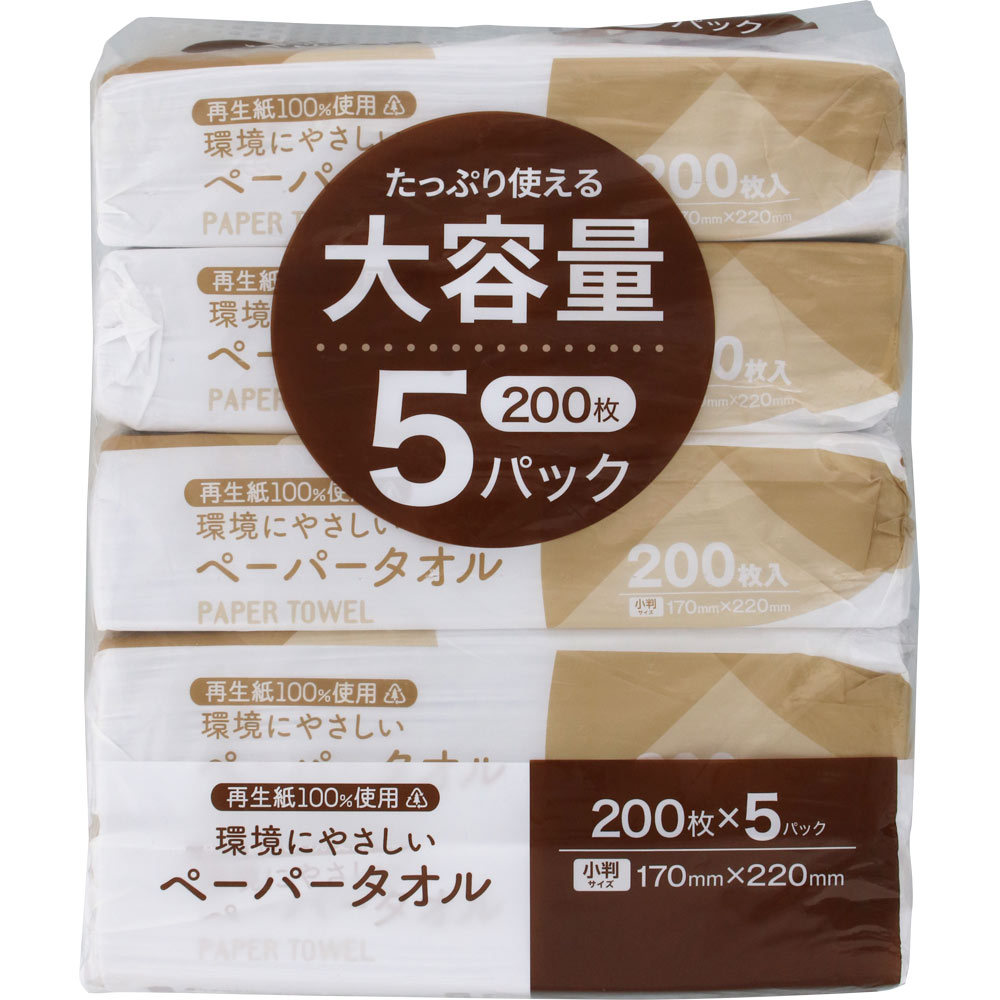 再生紙を100%使用した、環境にやさしいペーパータオルです。お手拭きや水回りの拭き取りなど、さまざまな用途でお使いいただけます。たっぷり使える大容量。200枚×5パック入り。