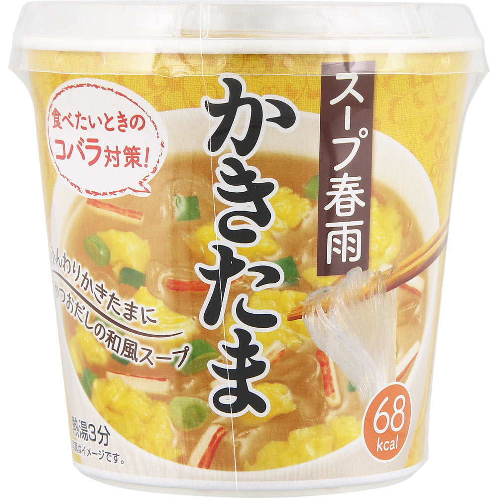 かつおだしのきいた和風スープに、ふんわりかきたまが入った春雨スープです。お湯をそそいで約3分でできあがり。あと1品ほしいときや温まりたいときにどうぞ。